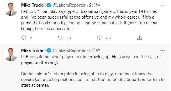 老詹还说:我可以打任何类型的篮球比赛,这是我的第19年篮球生涯,我在整个职业生涯的进攻端都取得了成功。如果这是一个需要大阵容的比赛,我也能够成功胜任,如果比赛需要打小阵容,我也能取得成功。我的比赛风格并不是单一的。