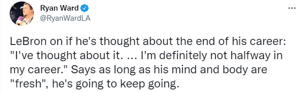 当被问及是否已经考虑过退役的事,詹姆斯回答道:“我想过,不过我的职业生涯肯定还没过半。只要的我思想和身体都是‘新鲜的’,我就会继续前进。