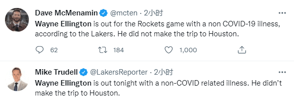 来源:JRS直播网12-29 10:21JRS直播网12月29日讯 ,湖人又有一名球员缺战火箭,湖人官方已经宣布,球队后卫韦恩-艾灵顿因非新冠症状将缺席今天的比赛,据湖人记者MIke Trudell报道,艾灵顿没有随队前往休斯敦,因此湖人队多达7名球员缺战火箭,浓眉在列。