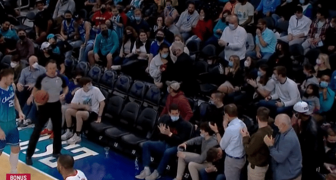 这是上半场结束前,火箭获得了最后一攻的机会,伍德抢下后场篮板,欲传球发动快攻,不料干扰下出现偏差,伍德不慎将球砸到场边女球迷,一时间场边的其他观众也都看向了这位女球迷。随后伍德也蒙着眼睛,表达歉意,球迷们也给这名被砸的女士送上掌声,好在她问题不大。
