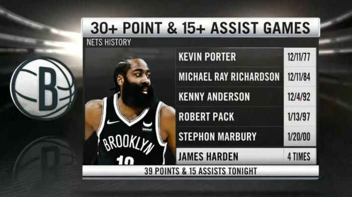 第一、哈登篮网生涯第4次轰下30+15,队史最多;篮网队史其他人加起来仅5次,马布里、迈克尔-理查德森、肯尼-安德森和罗伯特-派克各有1次。