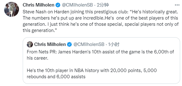 赛后谈到哈登的表现,纳什表示:他是历史上的伟大球员,他创造的纪录令人难以置信。他是这一代最优秀的球员之一。我认为他是那些特别的球员之一,不仅仅是这一代。