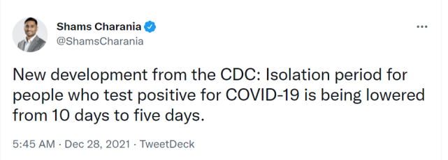 NBA缩短10天为6天的决定,并不是擅自做主,就在NBA发布这一消息后不久,美国疾病防控中心也传来消息,他们已经决定将阳性人员的隔离时间从10天缩短到5天,比NBA还少一天。