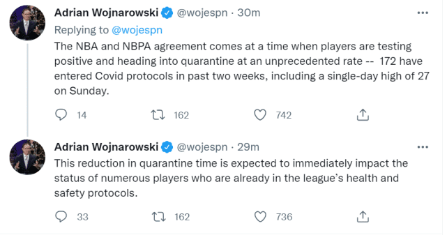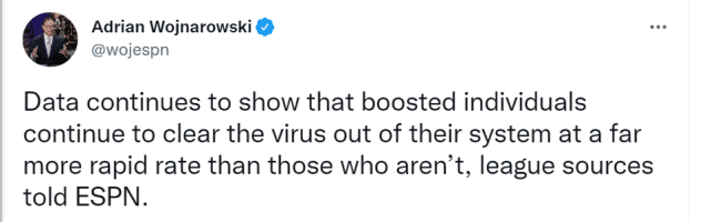 ESPN表示,按照联盟的新协议,理论上你这一天测试呈阳性,如果你符合标准,可以在第七天恢复比赛。消息人士透露,注射加强针的人,明显比未注射的能更快清除体内的病毒。