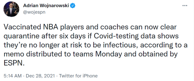 10天变6天!NBA已确定缩短隔离时间:加强针能更快清除病毒