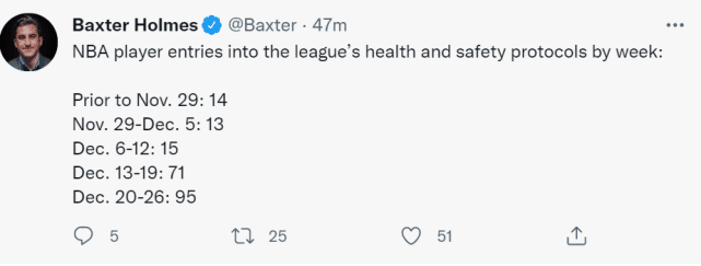 名记Holmes公布了开季至今每周的球员触发协议数据,最近半个月中招人数明显增加。11月29日(当地时间,下同)前,一共有14名球员触发;11月29日至12月5日,13名球员触发;12月6日至12月12日,15名球员触发;12月13日至12月19日,71名球员触发;12月20日至26日,95名球员触发。据此前报道,NBA官方并没有计划暂停赛季。