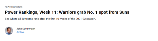 NBA官方实力榜更新!勇士超太阳升至第1,篮网第4湖人跌至第18