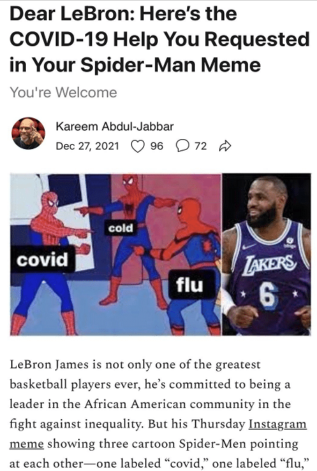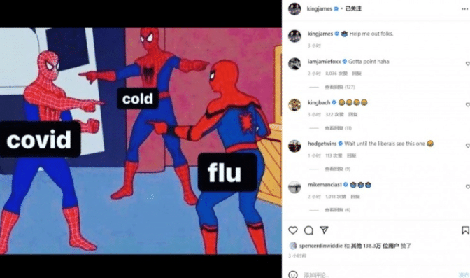 很显然天勾是在批评詹姆斯在这方面的影响力做得不够,毕竟詹皇在其中的影响力是非常大的,但却没有做出太多的表率。至于天勾批评詹姆斯的卡通图,指的是在前段时间他在社交媒体上晒出的一张图片,里面出现3个蜘蛛侠,分别代表:感冒、流感和新冠,还配文写道:“请大家帮我摆脱困境。”包括特雷杨等人都支持詹姆斯的这种说法。