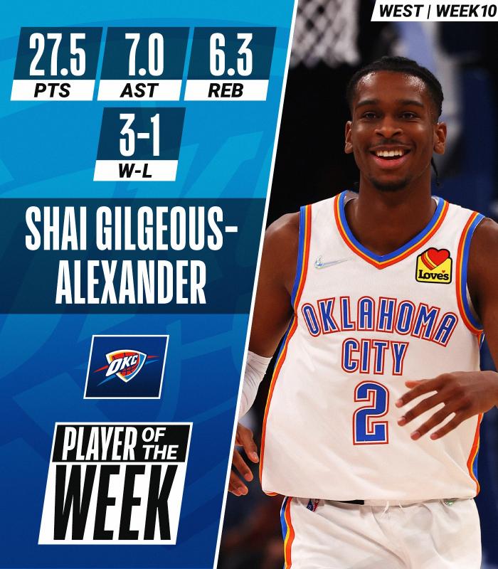 NBA公布周最佳!雷霆新星生涯首次当选,库里场均36分遗憾落选