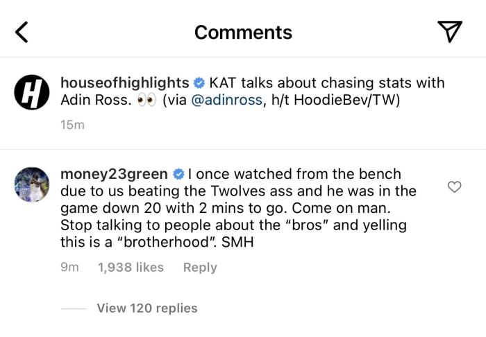 来源:JRS直播网12-28 10:23JRS直播网12月28日讯,最近一段时间,威少因糟糕的表现遭质疑,此前森林狼球星唐斯谈到威少,直言威少追求个人数据,对此勇士球星格林为威少鸣不平,指出唐斯曾在垃圾时间刷数据,并直言别再背后谈论兄弟了。