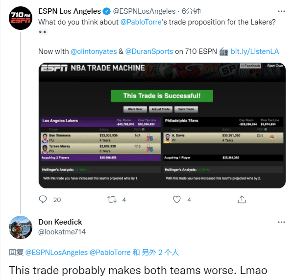 美媒的交易方案是湖人把浓眉交易到费城,得到西蒙斯和马克西,浓眉年薪是3536万美元,西蒙斯和马克西年薪加起来是3560万美元,薪资几乎对等;对于美媒关于湖人1换2引援西蒙斯,有球迷在评论区表示:这笔交易可能让两支球队(湖人和76人)都变得更糟糕。