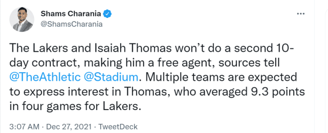 湖人目前遭遇五连败,16胜18负,排名西部第七。哈里森-费根表示,湖人选择放弃小托马斯不足为奇,因为当初他们签他,就是以为威少触发协议要至少休战7-10天,他们需要小托马斯的控球和投篮能力,没想到湖人刚签下小托马斯,威少就解除隔离。从查拉尼亚的报道来看,小托马斯还是通过这次重返湖人,引起了一些球队的兴趣,他应该可以继续留在NBA赛场。