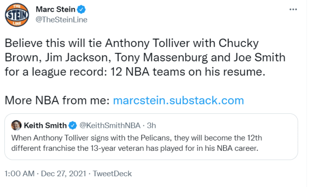 来源:JRS直播网12-27 15:07JRS直播网12月27日讯 ,36岁老将安东尼-托利弗将和鹈鹕签下一份10天合同,2021-22赛季将是他的生涯第14季。记者Keith Smith表示,鹈鹕是托利弗效力的第12支球队,而记者Marc Stein表补充道:“生涯效力12支不同的球队,意味着托利弗追平了联盟纪录,此前,查基-布朗、吉姆-杰克逊、托尼-马森伯格、伊斯梅尔-史密斯和乔-史密斯都曾做到过。”