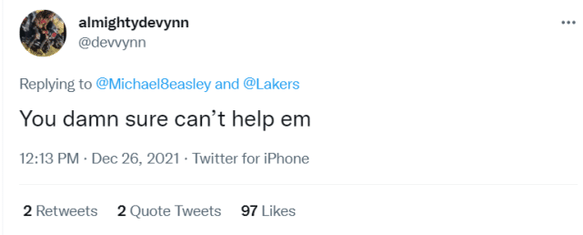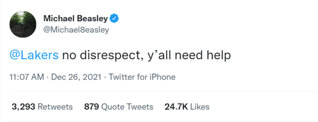 来源:JRS直播网12-27 15:03JRS直播网12月27日讯 ,前NBA球星迈克尔-比斯利更新社媒写道:“湖人,没有不尊重的意思,但你们都需要帮助。”显然,签约G联赛的比斯利,正在向5连败的湖人毛遂自荐,可球迷的回复却很扎心。点赞最多的一个回复是:“你肯定也帮不了他们。”