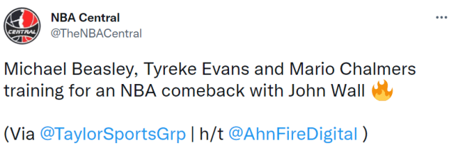 很快,有美媒晒出了比斯利的最新训练视频,他和泰瑞克-埃文斯、马里奥-查尔莫斯以及约翰-沃尔一起训练。埃文斯、查尔莫斯和比斯利的状况类似,两人也想重返NBA赛场,而沃尔虽然有合同在身,但与火箭谈崩,他也希望尽快打上球。