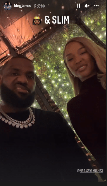 37岁詹姆斯和萨瓦娜身穿一套情侣黑色套装,詹姆斯脖子上挂着几串钻石项链,土豪气十足;詹姆斯还冲着镜头上演瞬间变脸,面部表情从发狠歪嘴到咧嘴大笑,很明显,目前詹姆斯的心情很不错。