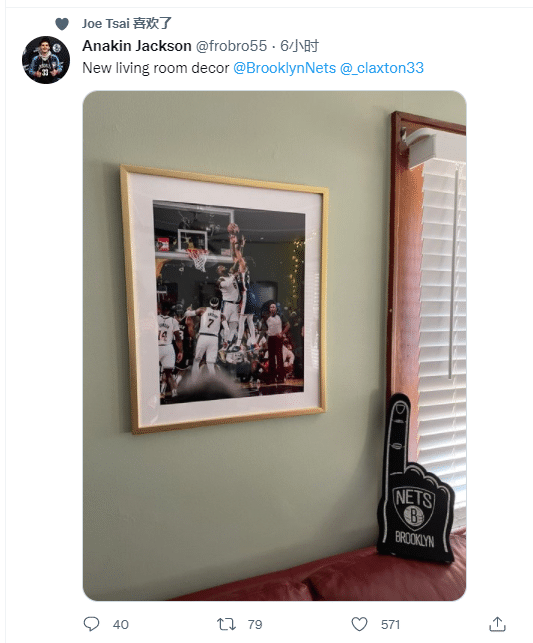 还有一件令老詹扎心的事,有篮网球迷把克拉克斯顿隔扣詹姆斯的画面,装裱起来挂在墙上,篮板老板蔡崇信亲手点赞。