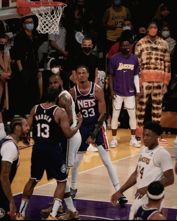 詹皇遭隔扣后续!美媒晒现场照:老詹哈登对视,篮网新星庆祝表情太狠