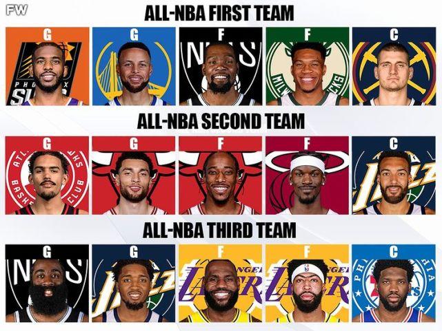 杜兰特场均29.7分7.9篮板5.9助攻,领跑得分榜,很有希望生涯第7次入选最佳阵容一阵。字母哥场均27分11.6篮板5.8助攻,这个赛季前他已连续3年入选最佳阵容一阵。约基奇是上赛季的MVP和一阵成员,本赛季状态依然出色,场均25.9分13.5篮板7.2助攻。