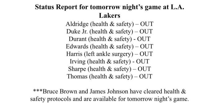 来源:JRS直播网12-25 21:16JRS直播网12月25日讯 ,篮网正式公布下一场对阵湖人的伤病报告,杜兰特、欧文、杜克、爱德华兹、阿德、夏普和托马斯都触发健康与安全协议而缺席年终大战,乔-哈里斯因伤继续休战;篮网全队8人缺战湖人,三巨头仅仅只剩哈登,登哥率领13人出战。
