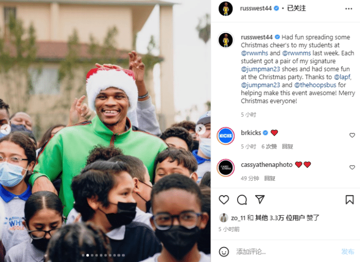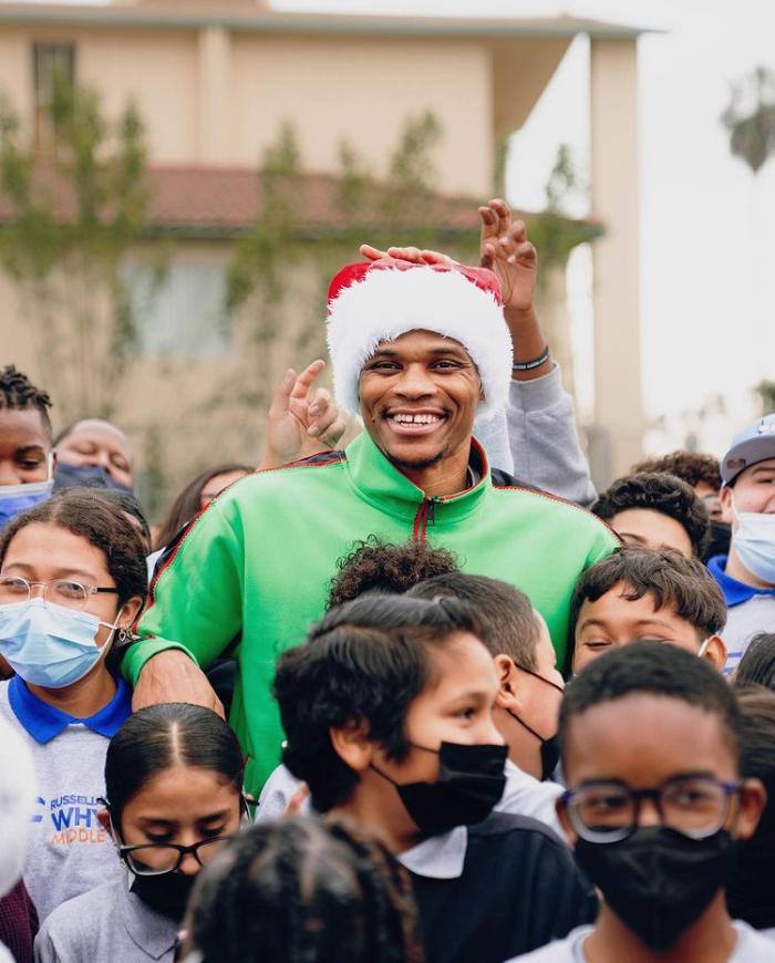 威少热衷于公益事业,专门为学生们举办圣诞公益活动,并且送给孩子们甜甜圈、热可可以及亲笔签名鞋,如此举动不禁让人为神龟点赞;威少与孩子们合影时大部分时间都戴着口罩,可也要不戴口罩的时候,与孩子们集体合影,威少咧嘴大笑十分开心,可此时没戴口罩有些令人担忧。