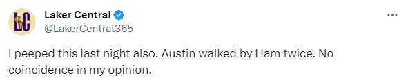 在湖人大胜独行侠比赛中,第三节里夫斯抢断欧文后持球反击,快攻中助攻普林斯上篮得分;里夫斯一防一攻点燃球馆;暂停期间,哈姆想要和里夫斯庆祝,结果后者直接走开并且和普林斯击掌;哈姆高举双手且面带笑容,伸手想和里夫斯击掌,结果又遭无视,里夫斯一直没有搭理哈姆,与助教击掌后坐回替补席。