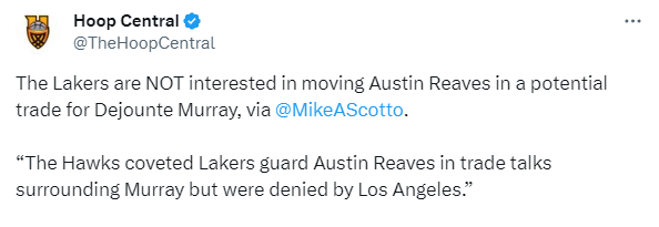 25岁的里夫斯是湖人非卖品,据名记Michael Scotto报道,老鹰在德章泰-穆雷的交易谈判中垂涎里夫斯,但遭到了湖人的拒绝。换言之,到目前为止,湖人仍旧拒绝用里夫斯换穆雷。