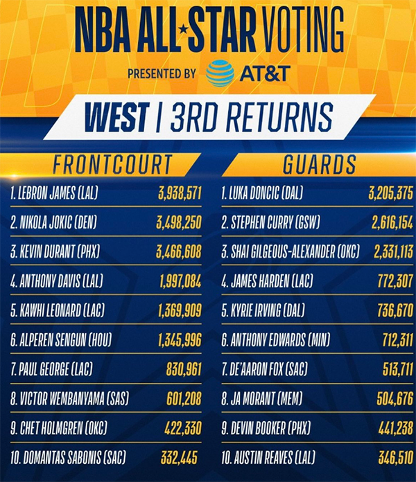 里夫斯早已成为洛城宠儿之一,在印第安纳全明星第三轮球迷投票结果中,里夫斯总共获得345610票,挤掉克莱-汤普森重返西部后场前十之列,东契奇和库里排在西部后场前二;詹姆斯3938571票仍旧领跑西部,但仍旧落后字母哥超过37万票,字母连续三轮力压老詹成为票王。