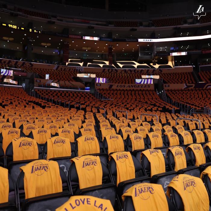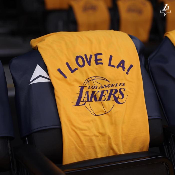 湖人将在中场为斯台普斯举办告别仪式,目前湖人已经在座椅上铺满了金色T恤,T恤上迎着湖人logo和“我爱LA”的字样,现场已经形成一片金色的海洋,这是一款纪念T恤。