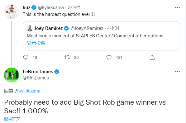 不久前,美记者Joey Ramirez发问:斯台普斯中心最伟大的时刻是什么?湖人旧将库兹马直言这是最难回答的问题;詹姆斯回复库兹马,发推写道:可能是罗伯特-霍里的Big Shot助湖人绝杀国王,1000%。