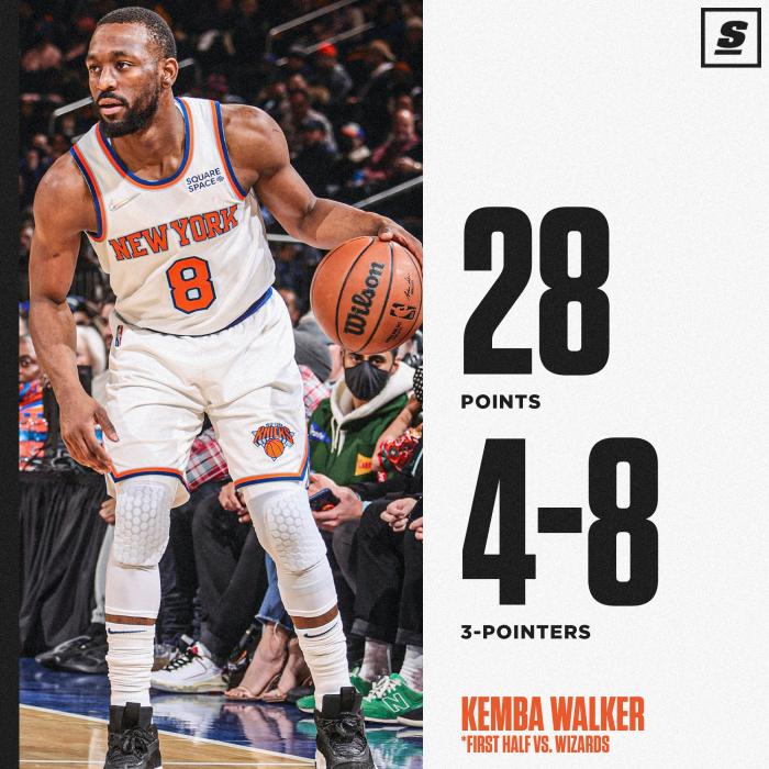 沃克上半场轰下28分,下半场尼克斯其他球员进攻哑火,还是靠沃克扛起进攻大旗,单节独砍13分,手感依旧火热;末节沃克手感下滑,虽然投进关键三分,但尼克斯一直被奇才压制,生死时刻,库兹马连续命中两记三分,最终尼克斯输掉比赛。