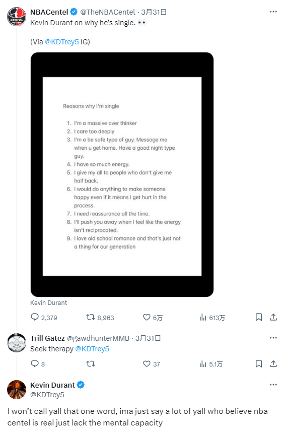 值得一提的是,此前一个名为“NBACentel”的账号造谣账号发布“杜兰特解释自己单身九大原因”——