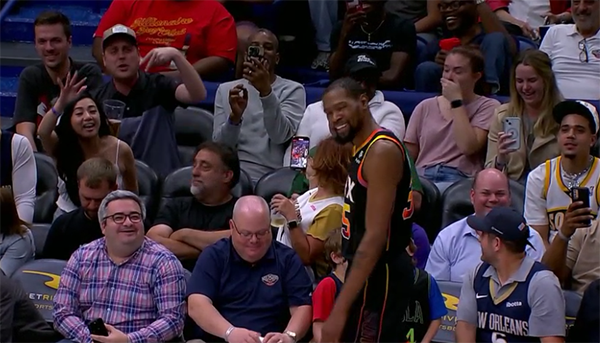 末节努尔基奇执行罚球时,杜兰特和鹈鹕主场内的球迷争吵起来,即使女球迷向他挥手也没用,杜小帅一直专心打嘴炮,吵了很久,最终无奈摊手,对此有球迷调侃难怪杜兰特找不到女友。