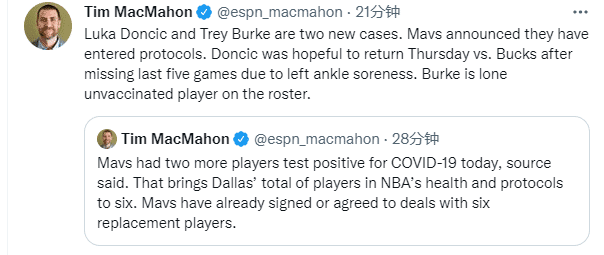 来源:JRS直播网12-23 14:06JRS直播网12月23日讯,NBA又有一名球星确诊新冠,据名记Tim MacMahon报道,独行侠队东契奇和特雷-伯克的新冠检测呈阳性,确诊感染新冠,因此独行侠队被隔离人数增至6人。