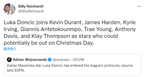 东契奇阳性感染新冠后,篮网记者BIlly Reinhardt发推写道:东契奇、杜兰特、哈登、欧文、字母哥、特雷-杨、安东尼-戴维斯和克莱-汤普森八大球星可能缺席年终大战。