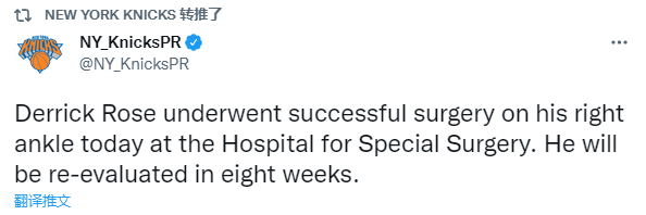 来源:JRS直播网12-23 13:53JRS直播网12月23日讯,尼克斯折损一员大将,据名记shams报道,尼克斯球星德里克-罗斯成功接受右脚踝手术,至少伤停8周,之后尼克斯官宣,罗斯预计伤停两个月。