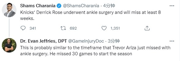 对于罗斯的伤情,医学专家Evan Jeffries表示,罗斯的伤情与湖人球员阿里扎的情况类似,本赛季阿里扎因脚踝伤势缺席了30场比赛。