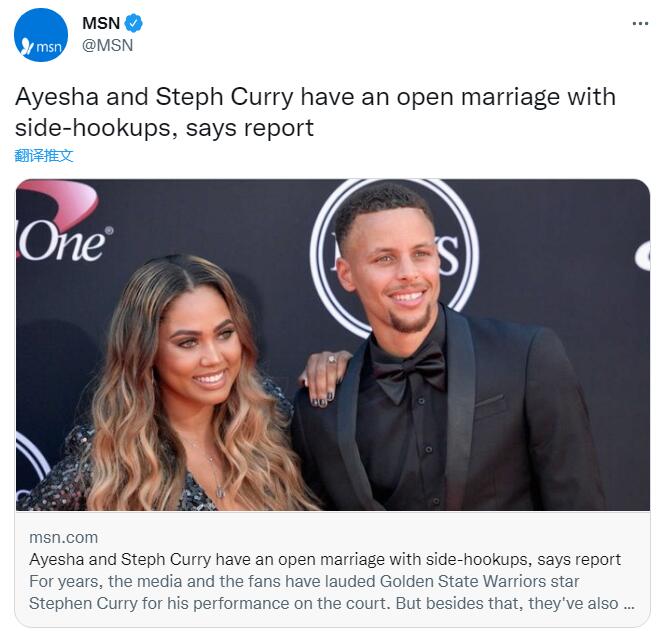 来源:JRS直播网12-22 11:25JRS直播网12月22日讯 ,来自微软旗下的媒体爆出令人感到不可思议的消息。来自著名八卦页面Deuxmoi上的匿名消息显示:一直以来以好男人示人的勇士巨星史蒂夫·库里,和他的妻子阿耶莎在保持恩爱婚姻的前提下,各自婚姻中有“旁观者”的存在。这一消息目前并未得到两人证实,但已经冲上美国热搜。