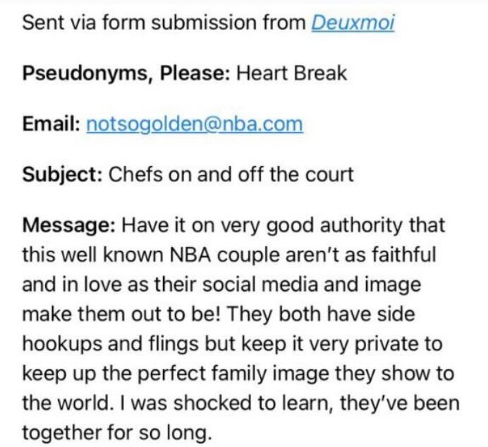 根据该媒体报道,这对明星夫妇在婚姻幸福的同时,达成了一项协议,那就是:开放式婚姻,各玩各的,互不干涉。INS账号Deuxmoi发布了一则匿名消息:据可靠消息,这对著名的NBA情侣并不像他们在社交媒体和照片上表现的那样忠诚!他们都有私底下的勾搭和风流韵事,但为了保持他们向世界展示的完美家庭形象,他们都非常保密。我很震惊,他们在一起这么久了。