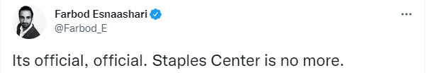 湖人主场正式更名,这意味着湖人在斯台普斯中心更名后的第一场比赛是湖人对阵太阳,一个新时代开启,最后再说一句,再见了,斯台普斯中心Staples Center!!!