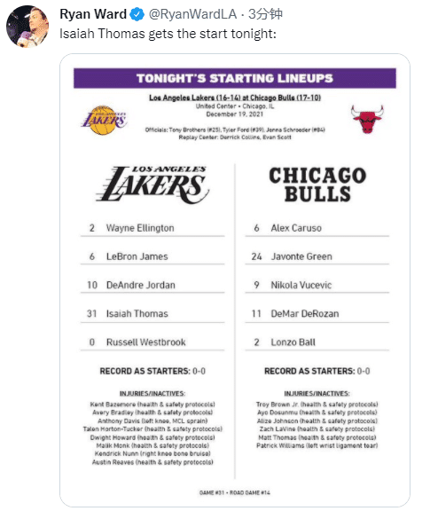 小托马斯联手詹皇首发出战,湖人再变阵!沃帅隔离又一套全新首发出炉