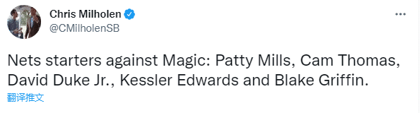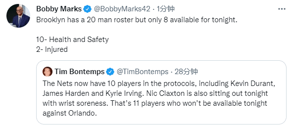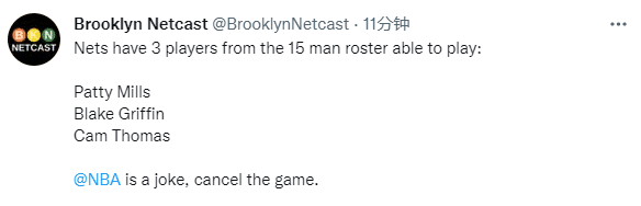 美媒Brooklyn Netcast发推感慨:篮网15人大名单仅剩三名球员可以出战,米尔斯、格里芬和托马斯,直言NBA是一个笑话,赶紧停赛。