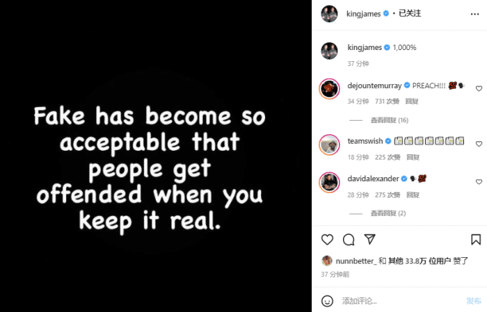 热议!詹皇发文:人们已习惯接受虚伪,当你保持真实反而被感到冒犯