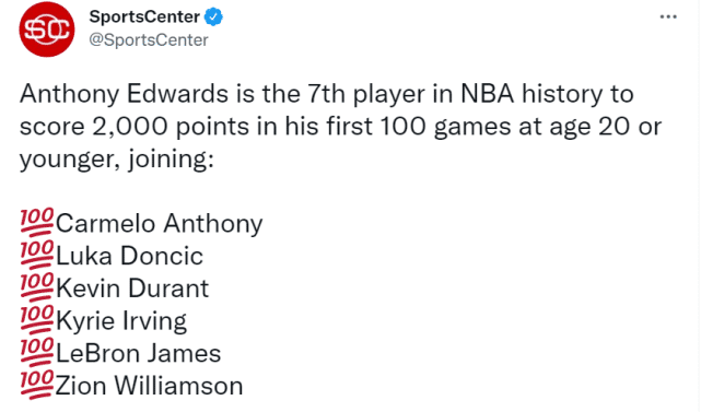 对掘金的比赛,也是爱德华兹的第100场比赛。他的生涯总得分来到2011分。算上爱德华兹,NBA史上只有7位20岁或以下的球员能在生涯前100场比赛至少得到2000分。其余六位是安东尼、东契奇、杜兰特、欧文、詹姆斯和锡安。比肩这些球员,足以证明爱德华兹的得分能力。
