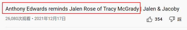 来源:JRS直播网12-18 15:31JRS直播网12月18日讯 ,在最新一期的播客节目中,前NBA球星贾伦-罗斯聊到了森林狼的状元安东尼-爱德华兹。罗斯指出爱德华兹常常上演疯狂的扣篮,而且现在三分能力越来越强。“我们曾说过他像卡特,但其实他更让我想起麦迪,当然,他的个子没有麦迪那么高,但他冲击篮筐的凶猛程度和超强的得分能力,确实让我想起了T-Mac。”