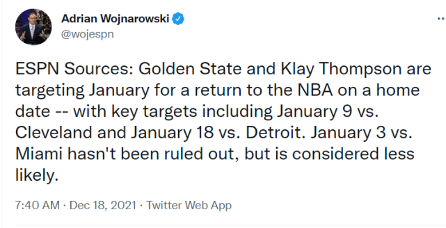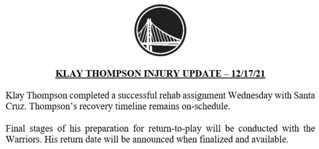 换言之,汤普森最快将在1月4日复出,最晚应该不会晚于1月19日。就在今天早些时候,勇士官方更新了汤普森的康复进展。官方报告写道:“克莱-汤普森已经顺利完成了在圣克鲁斯勇士(下属G联赛球队)的康复任务,他的回归仍在按计划进行。他将回到勇士完成康复的最后阶段,勇士会在合适的时间公布回归日期。”