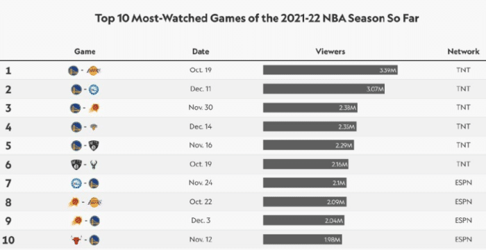 NBA全美直播收视率!勇湖大战第一,库里影响力大,雄鹿尴尬了