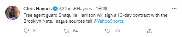 篮网签下恩尼斯之后,又签下沙奎尔-哈里森。