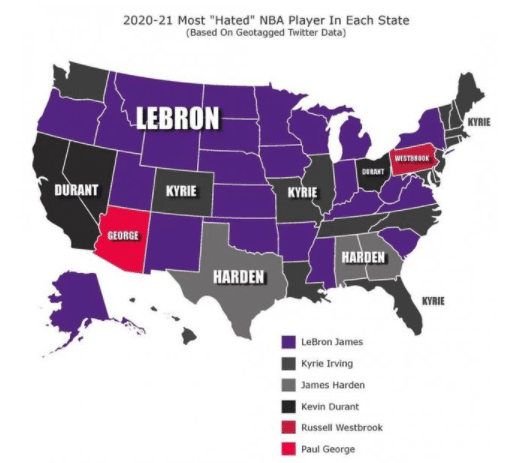除了美国各州最讨厌的球队之外,在今年6月份还有一份数据统计,是《Geotagged》根据社交媒体的数据统计进行汇总,指的是各大洲最令人憎恨的NBA球员,其中詹姆斯排名第一,有24个大州的球迷们讨厌他。这点和他是湖人的球员、自称国王、高调的行为等有直接的关系。