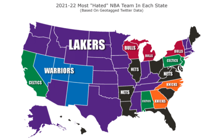 美国各州最讨厌的球队!湖人霸榜,篮网第二,詹姆斯最令人憎恨